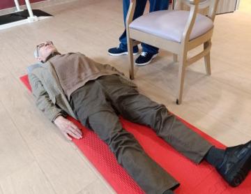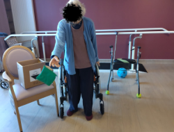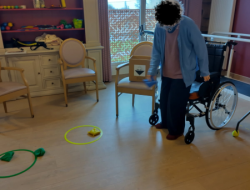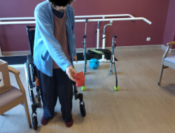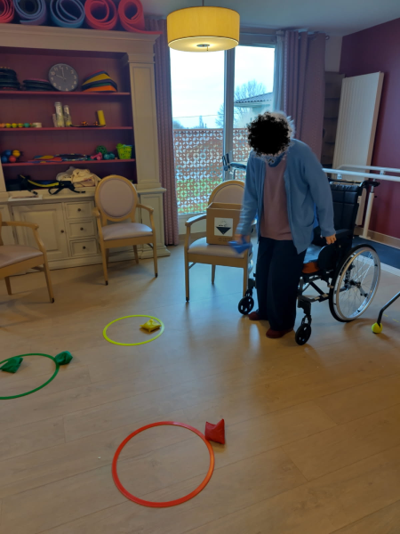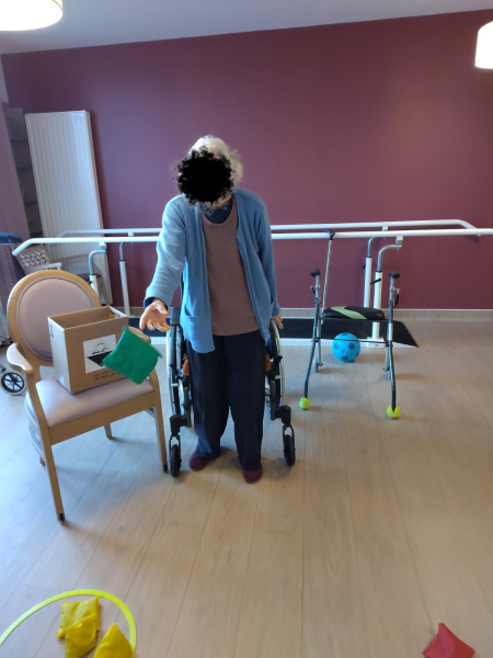La séance individuelle d’APA, encadrée par Julie, notre enseignante, était centrée sur le travail de l’équilibre aujourd'hui. Des exercices de lancés de sachets en position debout ont été proposés à une résidente afin de solliciter la coordination, la stabilité et la motricité.