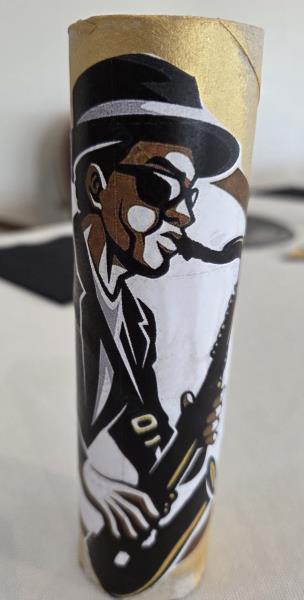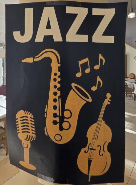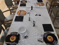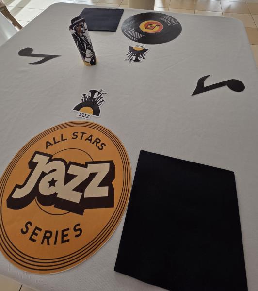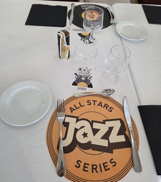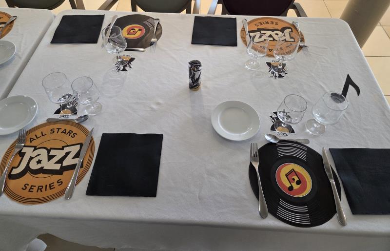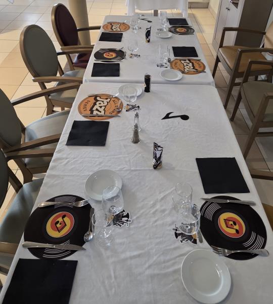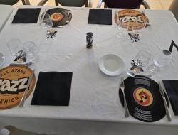 Pour notre repas à thème jazz hivernal du jeudi 12 février, la décoration de la table créait une ambiance élégante et feutrée inspirée du Jazz. Chaque place était soigneusement dressée avec un set de table en forme de vinyle, un dessous de verre aux motifs jazz, une note de musique décorative, un saxo et un joueur de saxophone, le tout accompagné d’une serviette noire apportant une touche chic et raffinée.