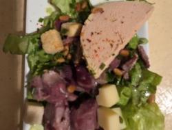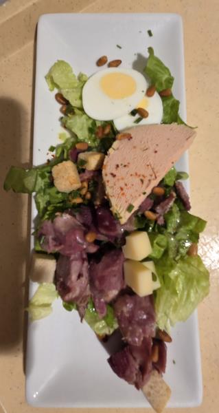 Le menu s’accordait parfaitement à cette atmosphère chaleureuse : un apéritif composé d’un kir et de petits feuilletés, suivi d’une salade landaise en entrée. Le plat principal, une blanquette de veau à l’ancienne servie avec ses tagliatelles, réchauffait les convives en cette saison hivernale. Après le plateau de fromages, le déjeuner s’achevait sur une touche sucrée avec une brioche perdue nappée de caramel au beurre salé, à la fois fondante et réconfortante, telle une ultime note de saxophone. 🎷