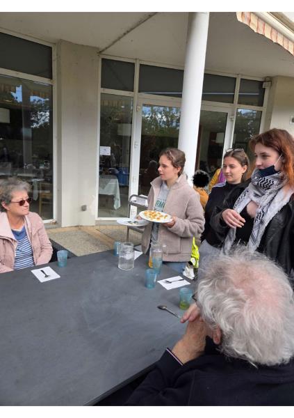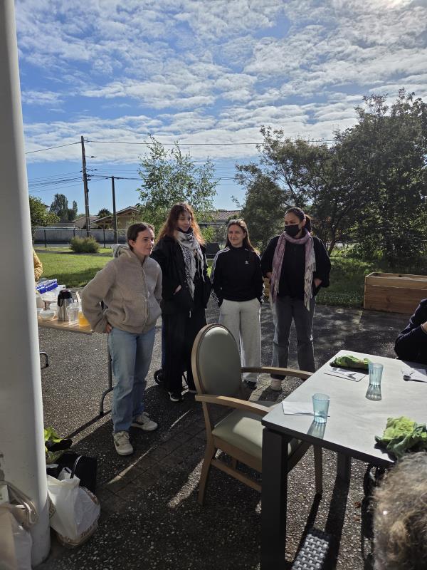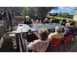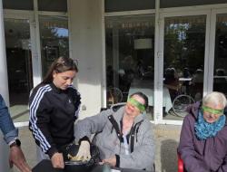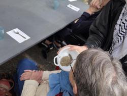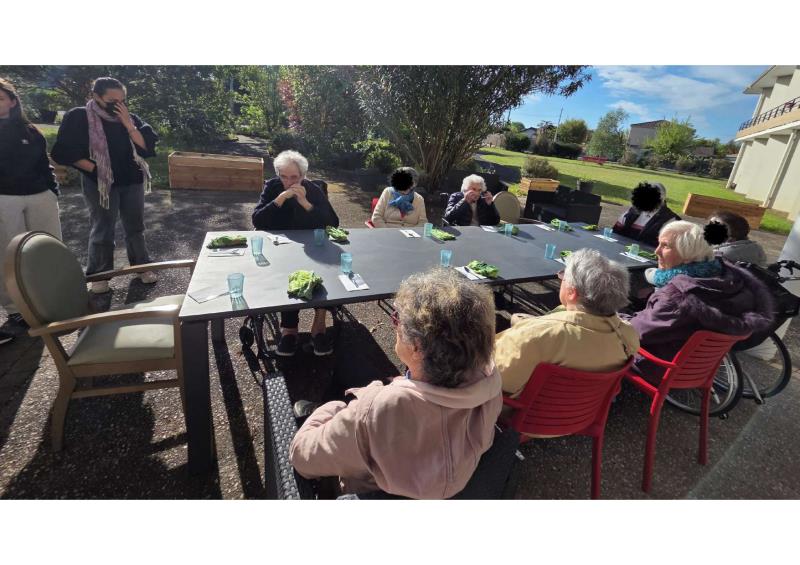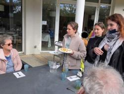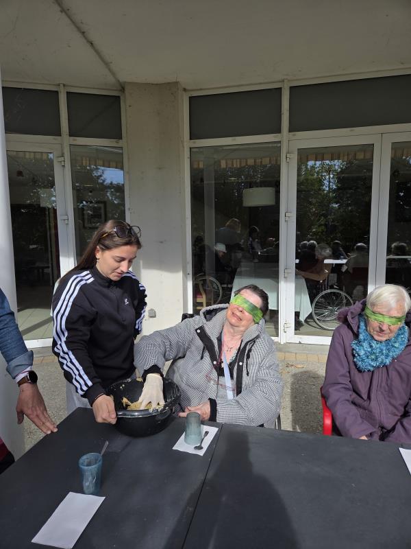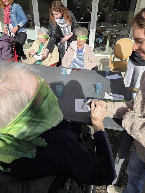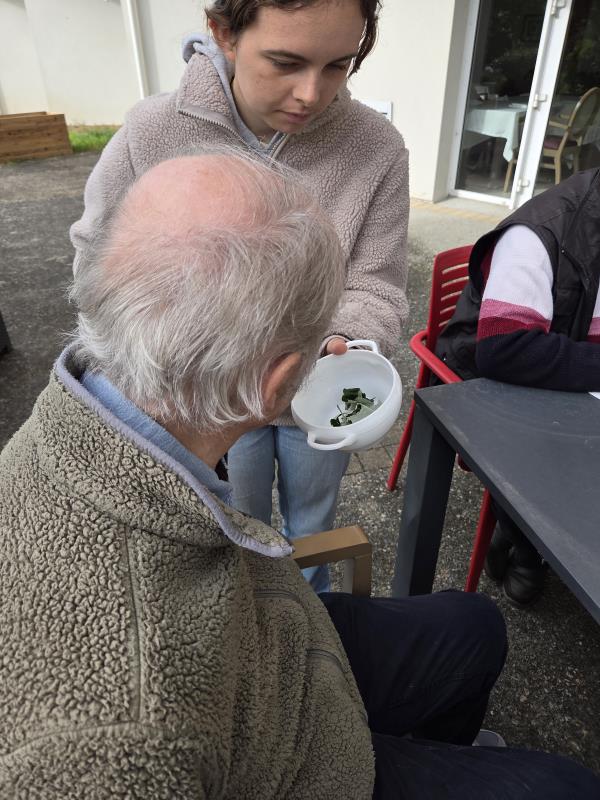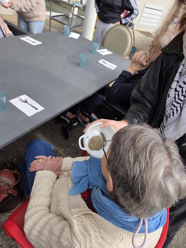 Au fil de différents ateliers, les résidents et bénéficiaires de l’accueil de jour ont pu éveiller leurs sens de manière ludique. Les yeux bandés, ils ont tenté de deviner des éléments naturels en les touchant, comme l’humus ou l’argile, et en les sentant, à travers des plantes telles que le thym ou le plantain lancéolé. Une dégustation conviviale a ensuite permis de découvrir des tisanes à base d’ortie, de ronces, de feuilles de framboisier, de menthe et de thym, accompagnées de toasts gourmands aux olives, à l’ail et aux herbes, ainsi que de miel.