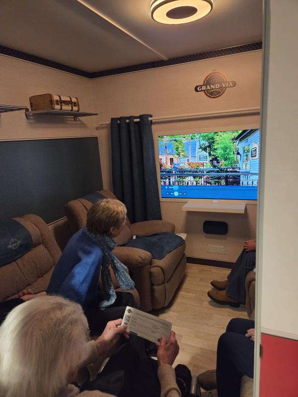 Dans l’unité protégée, le train interactif offre à certains résidents et à certaines familles une expérience unique d’évasion. Installés confortablement, ils embarquent pour un voyage virtuel à travers de magnifiques paysages : montagnes, campagnes, bords de mer ou villes emblématiques. Grâce à cette immersion, ils peuvent redécouvrir le plaisir de voyager, stimuler leurs souvenirs et partager des moments d’émotion. Ce dispositif ludique et apaisant favorise le bien-être, l’échange et l’éveil des sens.