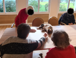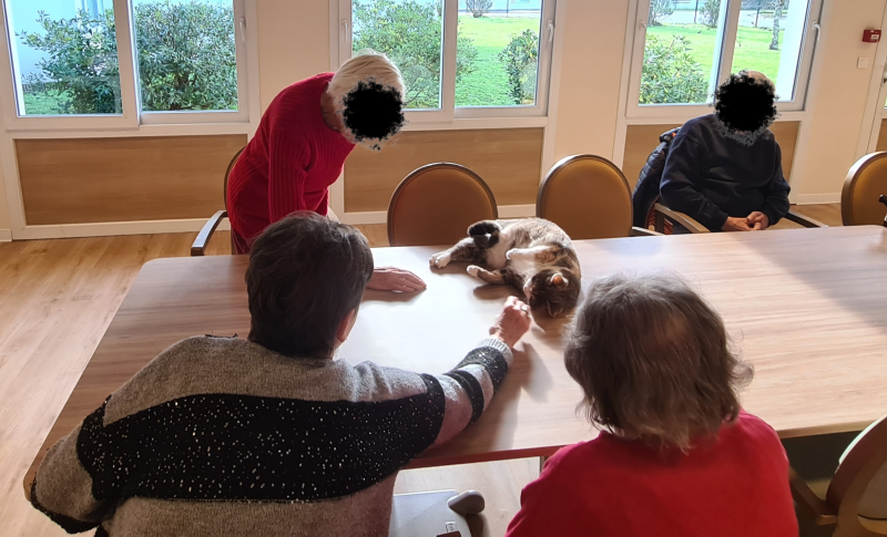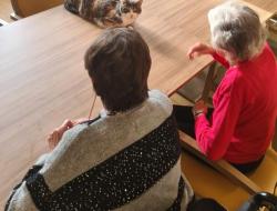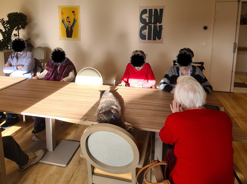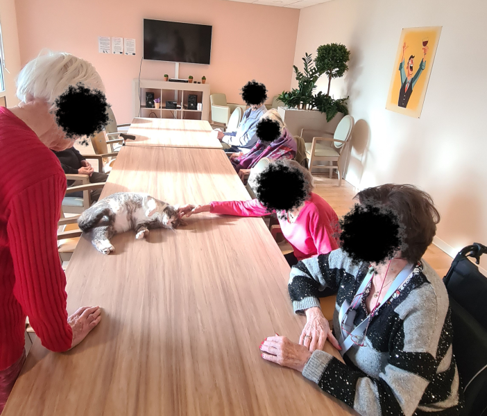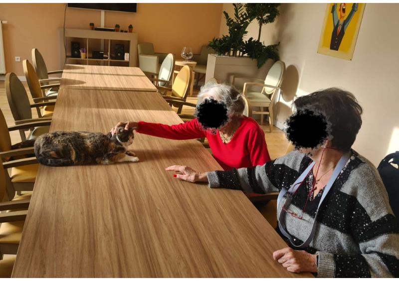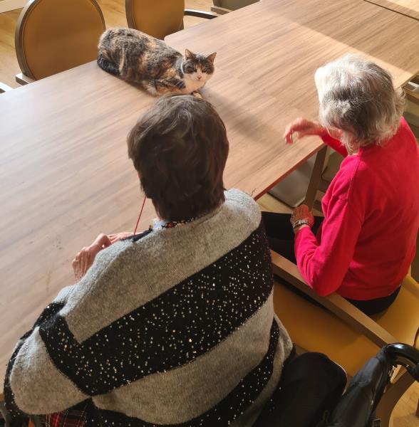 Pendant le début de l’activité, Uma, l’un des trois chats de la résidence, nous a fait l’honneur de sa visite. Elle a reçu de nombreuses caresses, pour le plus grand plaisir des résidents, toujours ravis du contact et de la présence apaisante des chats au sein de la résidence. 🐾