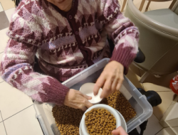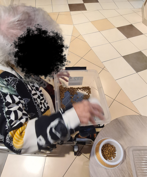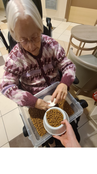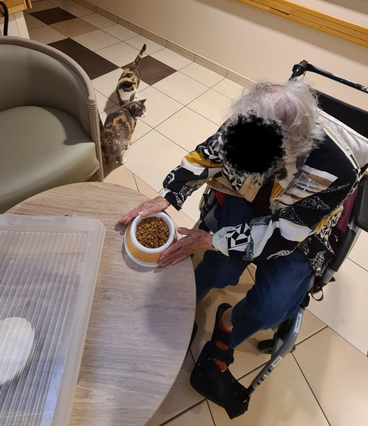 Dans le cadre des activités quotidiennes, certains résidents prennent plaisir à participer au nourrissage des chats de la résidence. Ce geste du quotidien leur offre un rôle actif et valorisant, tout en apportant douceur et compagnie aux animaux. En s’impliquant ainsi, les résidents contribuent à la vie de l’établissement, renforcent leur sentiment d’appartenance et conservent des repères importants dans leur routine.